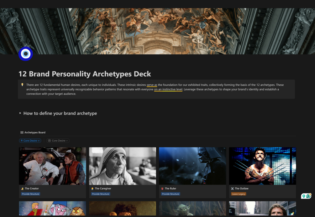 Transform your brand with the power of personality. The "12 Brand Personality Archetypes Deck" is a comprehensive Notion template designed to help brand designers, brand strategists, and marketing professionals tap into the universal patterns of human behavior. With this deck, you'll leverage the fundamental human desires to shape your brand's identity and forge a deep connection with your target audience.